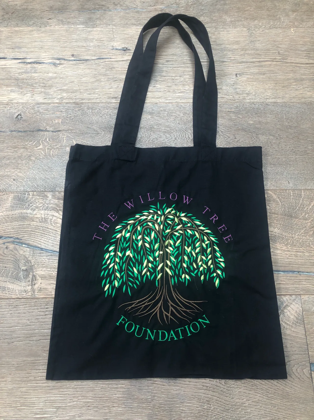 This black cotton Tote Bag measuring 32 x 42cm has The Willow Tree Foundation logo on one side.